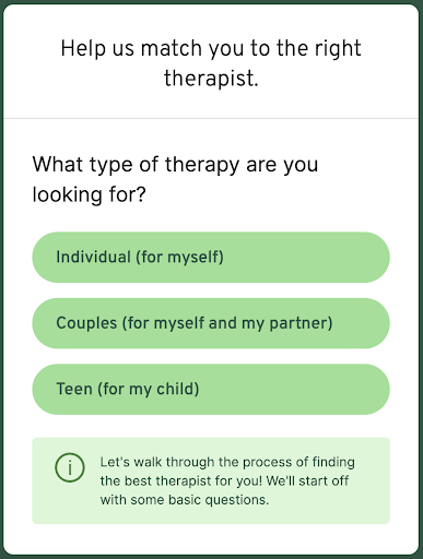 Finding a therapist with Grow Therapy is simple. All you need to do is input your state, insurance or payment preference, including cash, and the broad reason you’re seeking therapy. You can also select whether you’d rather be seen virtually or in-person.