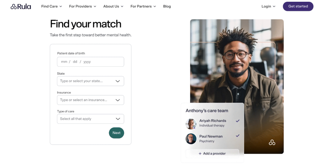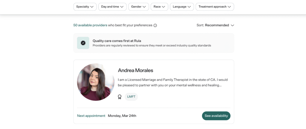Rula’s scheduling functionality is very similar. However, they ask for a bit of personal information before you get to see available therapists. You will first input your birthday, state, insurance, and type of care you’re looking for. From here, you’ll input your full name and phone number before you can browse providers. Once you see providers who meet your criteria, you’ll see their availability and you can book an appointment directly.