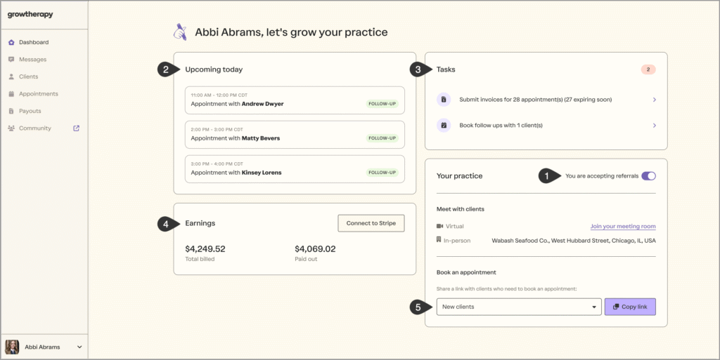 Running a private practice requires juggling multiple tasks, managing appointments, and staying on top of administrative responsibilities. But as therapists, you want your focus to be primarily on providing quality care to your clients. Grow offers the tools, technology, and support therapists need to thrive! Our provider dashboard serves as a quick view into your practice’s performance. Let’s take a look at the provider dashboard, and what it can add to your private practice: