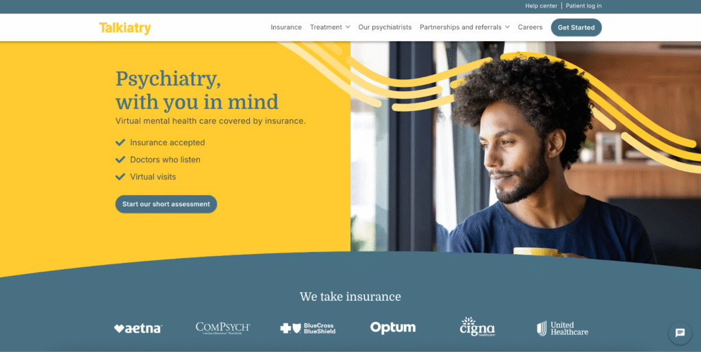 Similar to Grow Therapy, there are many reasons to believe Talkiatry is a trustworthy service. In the footer of their website, the Talkiatry team claims they are FSA/HSA-approved and HIPAA-compliant. Dozens of insurance companies trust Talkiatry with the care of their members. Their Co-Founder and Chief Medical Officer, Georgia Gaveras, DO, is a triple-board certified psychiatrist with decades of experience.