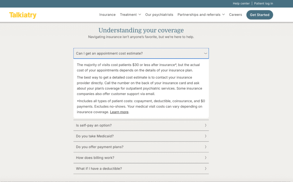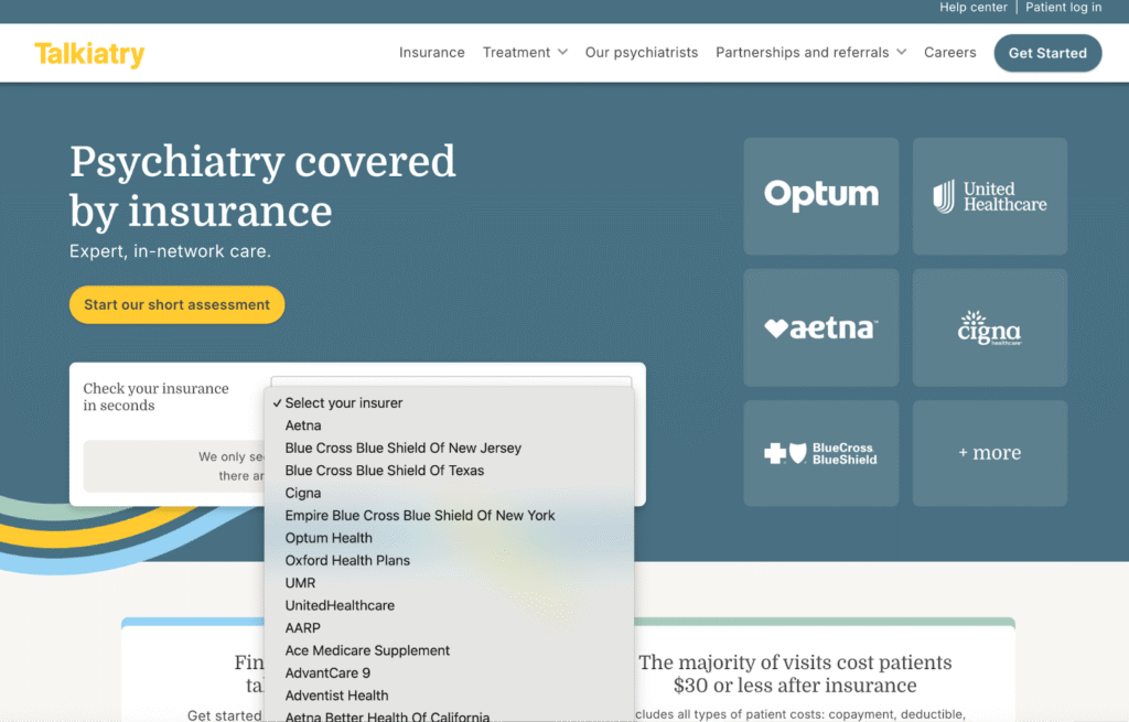 Talkiatry lists in its frequently asked questions that most visits cost $30 or less after insurance, though the exact amount depends on each individual’s insurance coverage.
