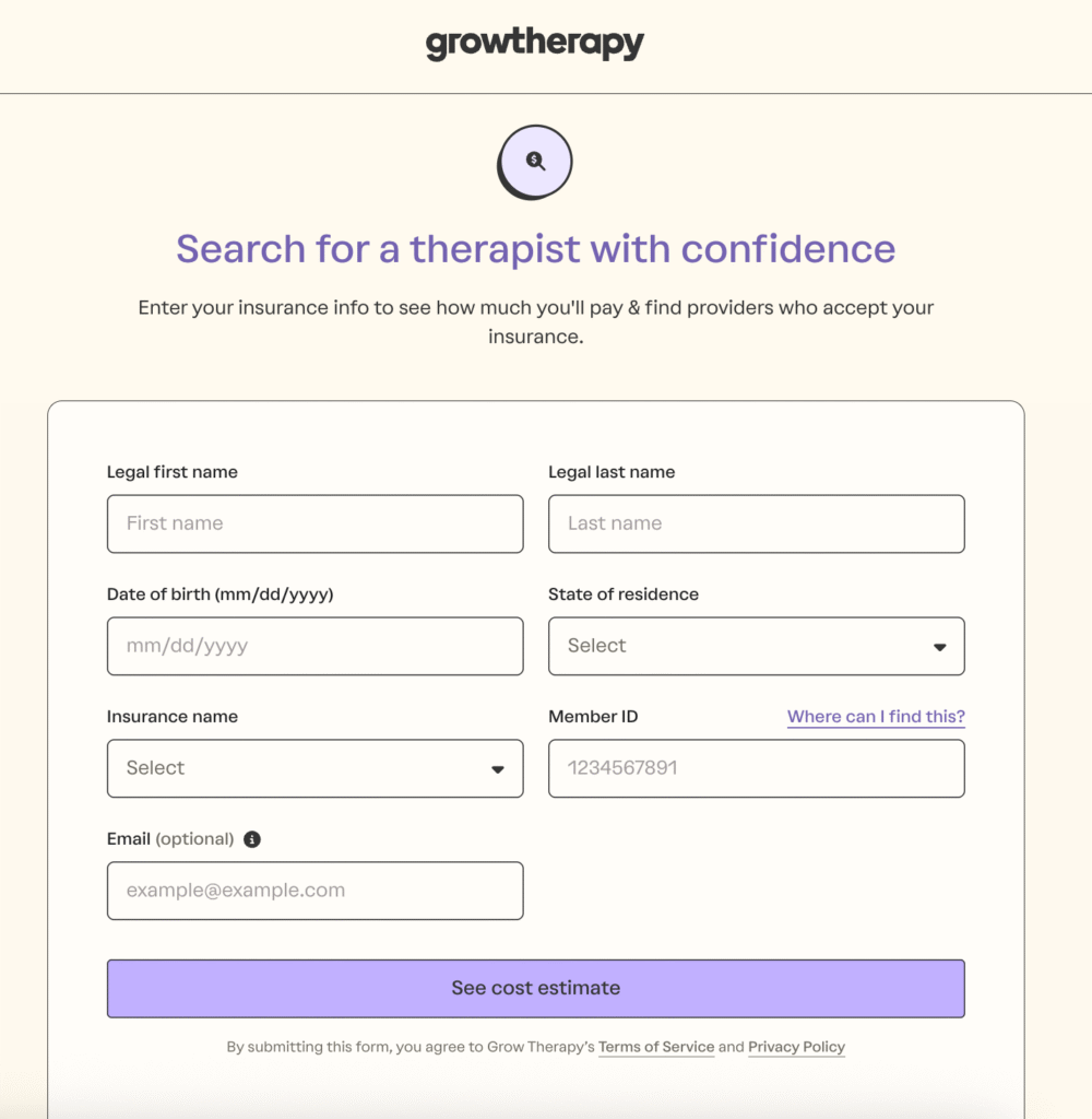 Grow Therapy features a pay-per-session model, keeping care flexible and affordable. The platform highlights an average cost of about $21 per therapy session after insurance, with some paying as low as $0, making it one of the most affordable options for insured clients. Patients can use Grow Therapy’s cost estimate calculator to preview what they’ll pay ahead of time based on their insurance. The booking process is fast and straightforward, allowing clients to browse providers before entering detailed personal information.